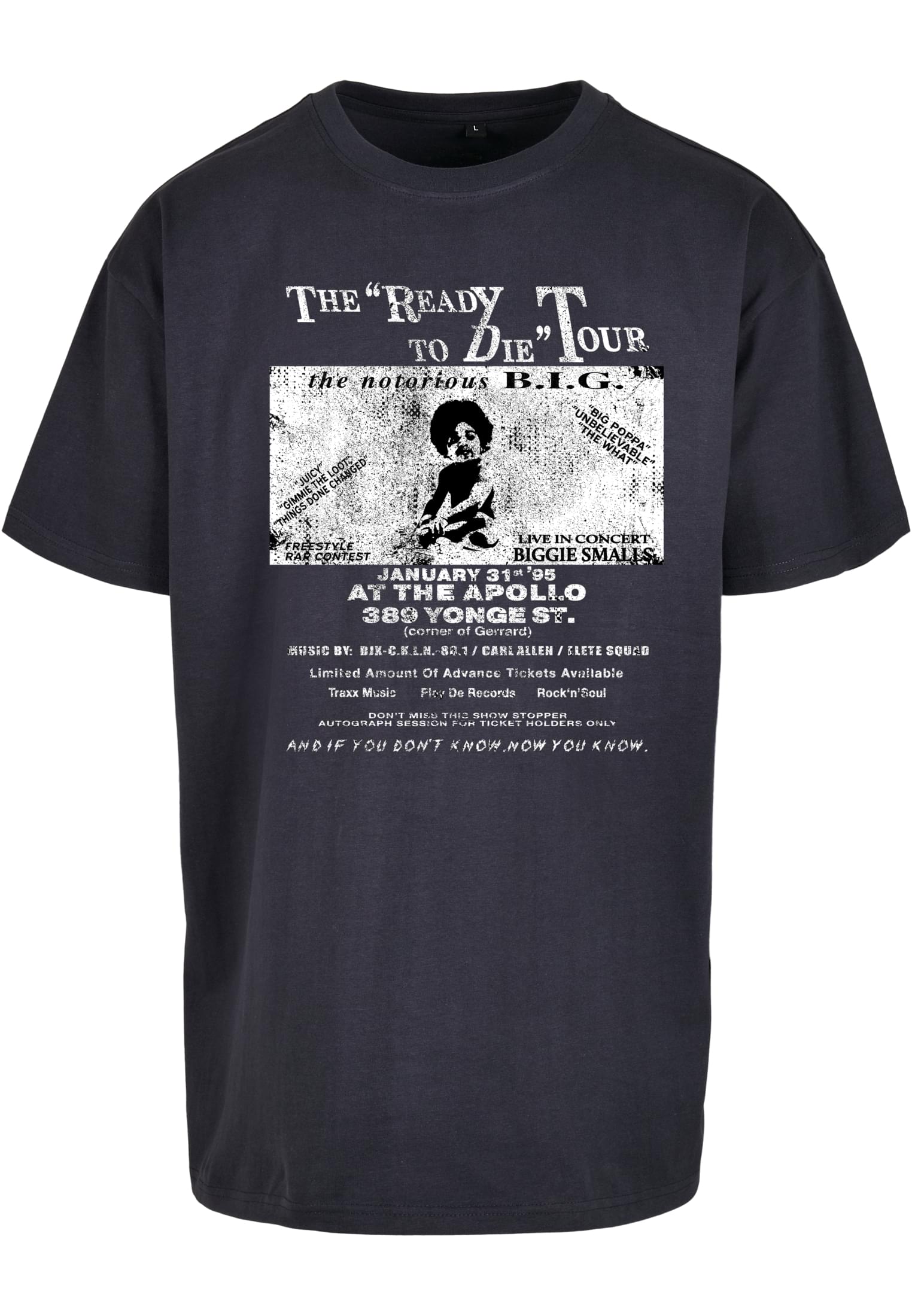 Notorious B.I.G Fans aufgepasst hier kommt ein besonderer Merchandise für euch. Als Frontmotiv auf dem stylischen T-Shirt ist das bekannte Tour Plakat des Rappers seines Hit Albums Ready to die. Ein echter Hingucker auf jedem Hip Hop Festival für alle Fans! And if you dont know now you know.
